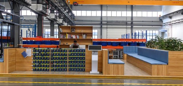 海佳現(xiàn)代化智能總裝車間是國(guó)際著名設(shè)計(jì)公司為海佳機(jī)械定制設(shè)計(jì)的全球首個(gè)織機(jī)脈動(dòng)式裝配生產(chǎn)線體。整個(gè)總裝車間由平臺(tái)安裝區(qū)、脈動(dòng)線組裝區(qū)、模組組裝區(qū)、試機(jī)平臺(tái)區(qū)四個(gè)部分組成。整個(gè)裝配過程的物料運(yùn)轉(zhuǎn)和配送,全部由AGV和RGV系統(tǒng)自動(dòng)調(diào)度,整條線體除了整機(jī)裝配外,全部實(shí)現(xiàn)自動(dòng)化生產(chǎn)。目前線體承擔(dān)的是海佳噴水織機(jī)和噴氣織機(jī)的裝配,單班每天的產(chǎn)量在21-22臺(tái)。